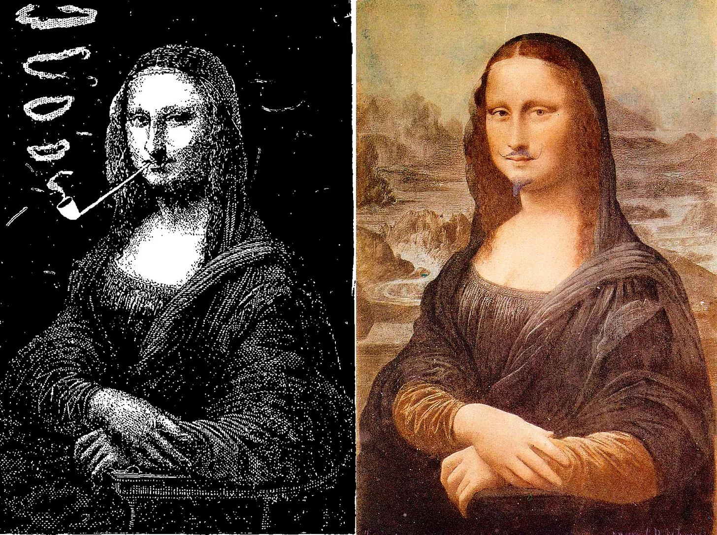 Algunos ejemplos de las obras mostradas en esas exhibiciones son las animaciones protosurrealistas de Ėmile Cohl o la Mona Lisa fumando en pipa de Sapeck, concebida con décadas de adelanto sobre la versión que pintarrajeara Duchamp con bigote y perilla en 1919.