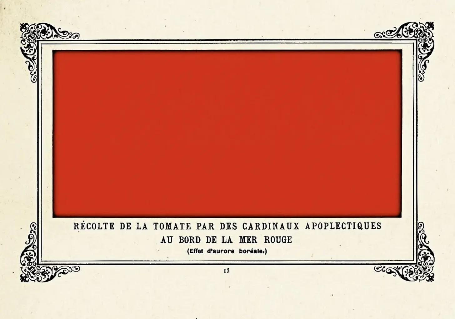 Pero, además, al presentar en otra edición el mismo cuadro rojo con un título alternativo (Cosecha de tomates por cardenales apopléticos a orillas del mar Rojo) aporta con sorna y desparpajo lo que puede considerarse como la primera crítica a los futuros excesos del arte conceptual.